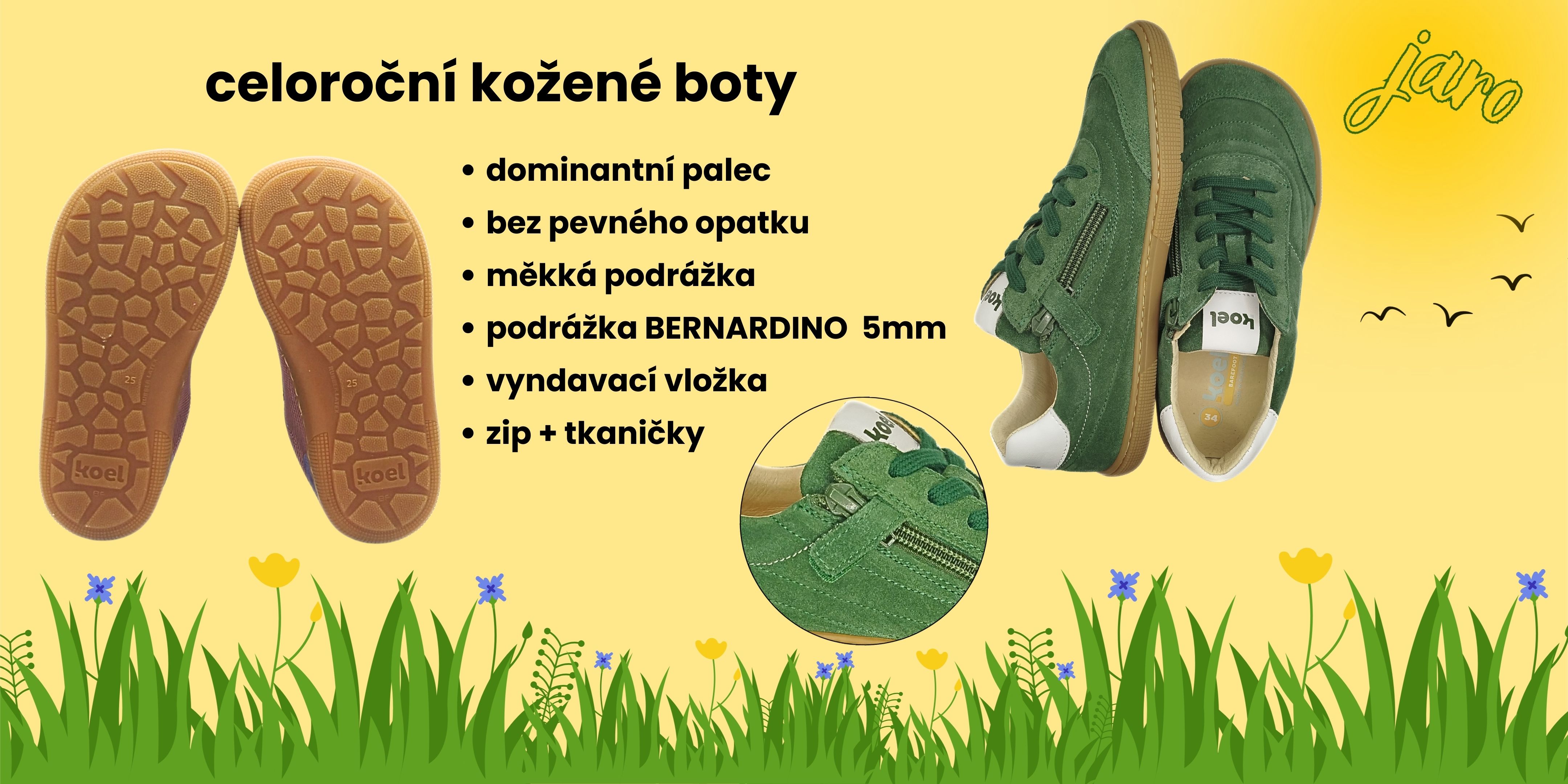 Nizozemský výrobce barefoot bot KOEL4KIDS klade velký důraz na zákazníka, a tak neustále pracuje na vylepšování designu a funkčnosti svých bot. Botky mají až 4 mm tenkou podrážku. Ekologicky šetrná výroba potěší každého, kdo právě hledá sandálky, tenisky, celoročky ale i zimní botky pro své dítko.